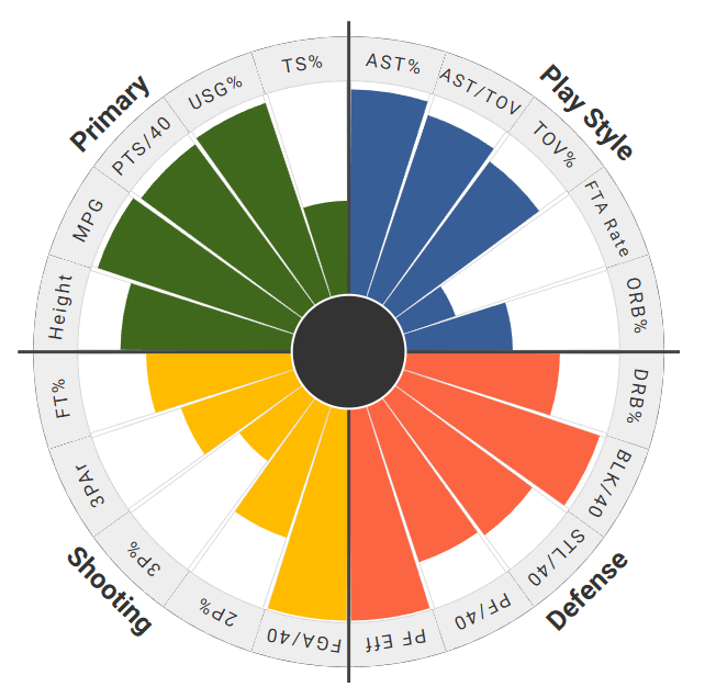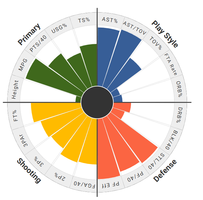 She carries a larger share of offensive demand. She impacts both ends of the floor. Her wheel reflects a player whose presence shows up across the game — scoring, facilitating, defending, and influencing possessions beyond the box score.